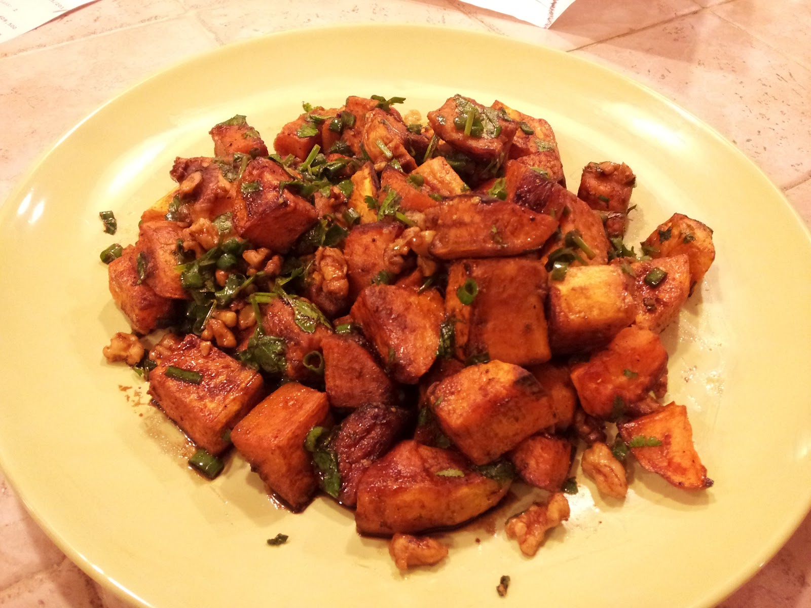 Preheat oven to 450˚. Place sweet potatoes on a baking pan. Drizzle with 3 tablespoon Chipotle oil and sprinkle with salt and pepper; toss to coat. Bake at 450˚ for 30 minutes or until tender, turning after 15 minutes. In a bowl whisk together remaining 2 tablespoon oil and balsamic vinegar. Set aside. Place walnuts in a medium skillet; cook over medium heat 4 to 5 minutes, shaking pan frequently. Combine potatoes, walnuts, onions, cilantro in a bowl. Add oil and vinegar; toss gently to coat.