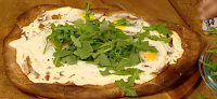 Spread softened cheese, salt and pepper on the baked dough. Crack the four eggs on top and top with arugula . Place pizza back in the oven for three to five minutes until the eggs are cooked.