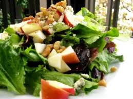 Combine greens and cucumbers in a large salad bowl. Layer the greens with the tomatoes, walnuts and apple slices. Pour the dressing over the salad and gently toss. Finally scatter the cheese on top. Sprinkle with sea salt and pepper to taste.