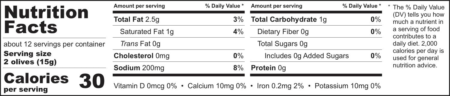 Ingredients: Halkidiki olives, sunflower oil, pasteurized blue cheese (cow milk, cheese culture, rennet, salt, P. roqueforti), spices, lactic acid (acidity regulator), modified potato starch (stabilizer), sea salt, citric acid (acidity regulator). CONTAINS: MILK